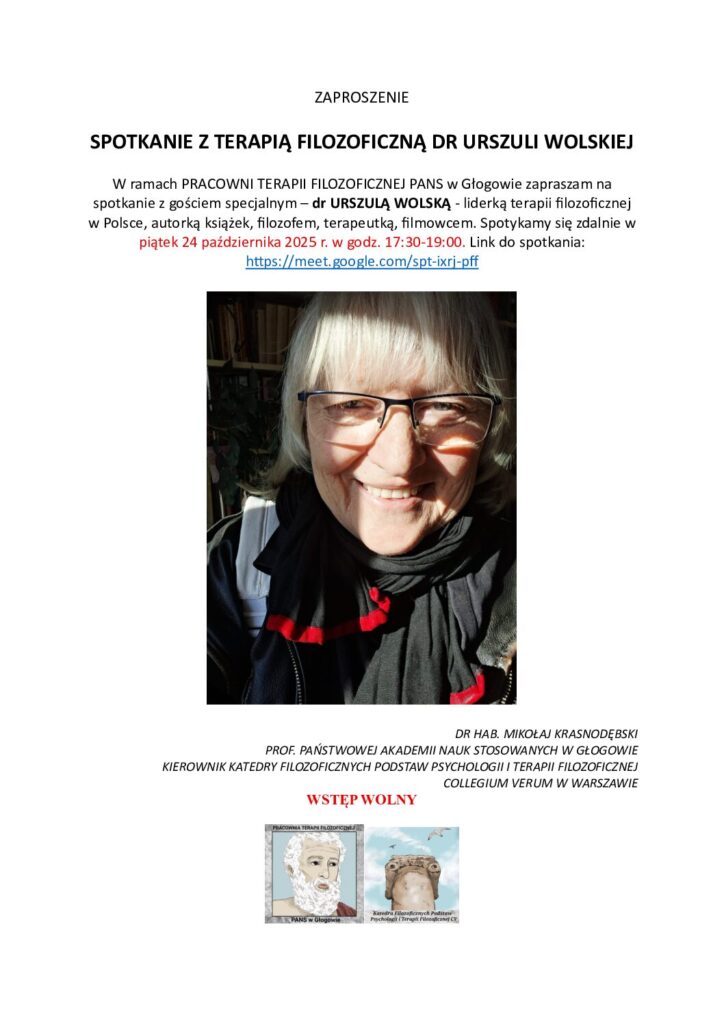 16 paź SPOTKANIE Z TERAPIĄ FILOZOFICZNĄ DR URSZULI WOLSKIEJ Posted at 12:01h in Aktualności by Jarosław Domański 0 Likes